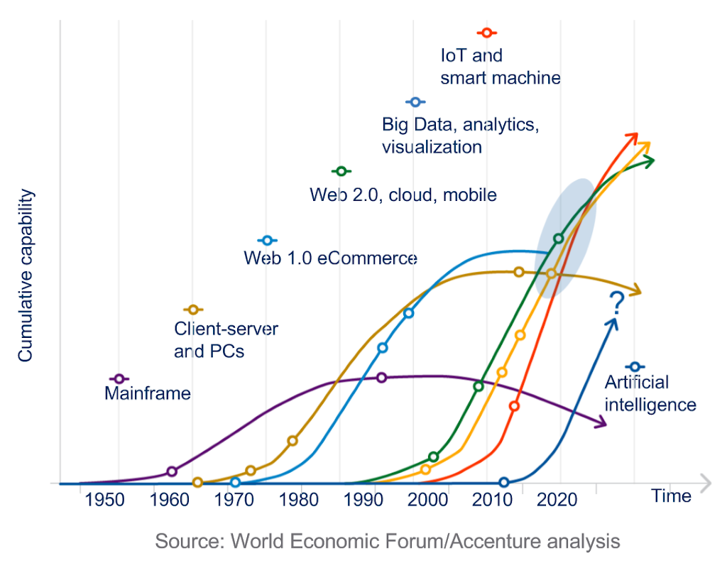 El WEF destaca que los efectos combinatorios de la tecnología están acelerando este cambio y lo muestra en el siguiente gráfico.