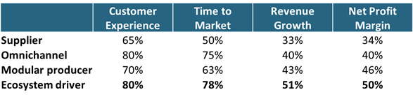Según estudio del MIT CISR, las empresas cuyo modelo es “Ecosystem Driver” acaban destacando sobre sus competidoras en diversos aspectos como Experiencia de Usuario, Time to Market, Crecimiento y Margen Neto. La siguiente tabla resume estos resultados.